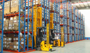 此類倉庫中,低、高位倉庫大多用前移式電瓶叉車、平衡重電瓶叉車、三向叉車進(jìn)行存取作業(yè),貨架較矮時也可用電動堆高機,超高位倉庫用堆垛機進(jìn)行存取作